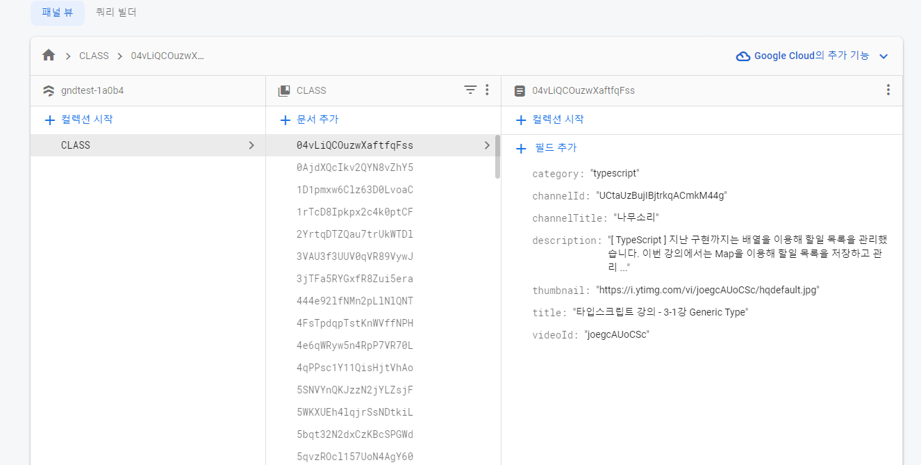 그럼 파이어베이스 파이어스토어(데이터베이스)에 이런식으로 데이터가 저장된다.