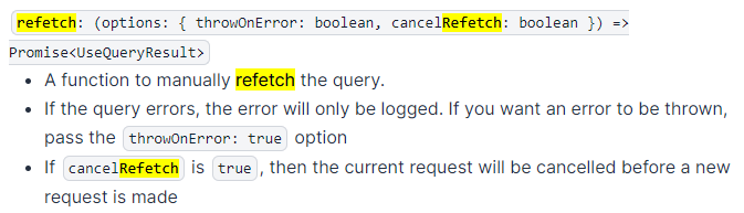 이럴 땐 useQuery의 기본 option 중 하나인 refetch를 통해 수동으로 다시 쿼리를 가져올 수 있다.