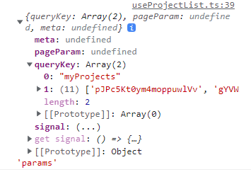 queryFn에 정의해준 함수에서 매개변수를 콘솔로 찍어보면 아래와 같이 객체가 찍히는 것을 알 수 있다.