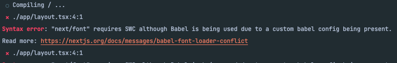 Syntax error: "next/font" requires SWC although Babel is being used due to a custom babel config being present.