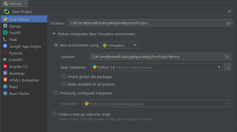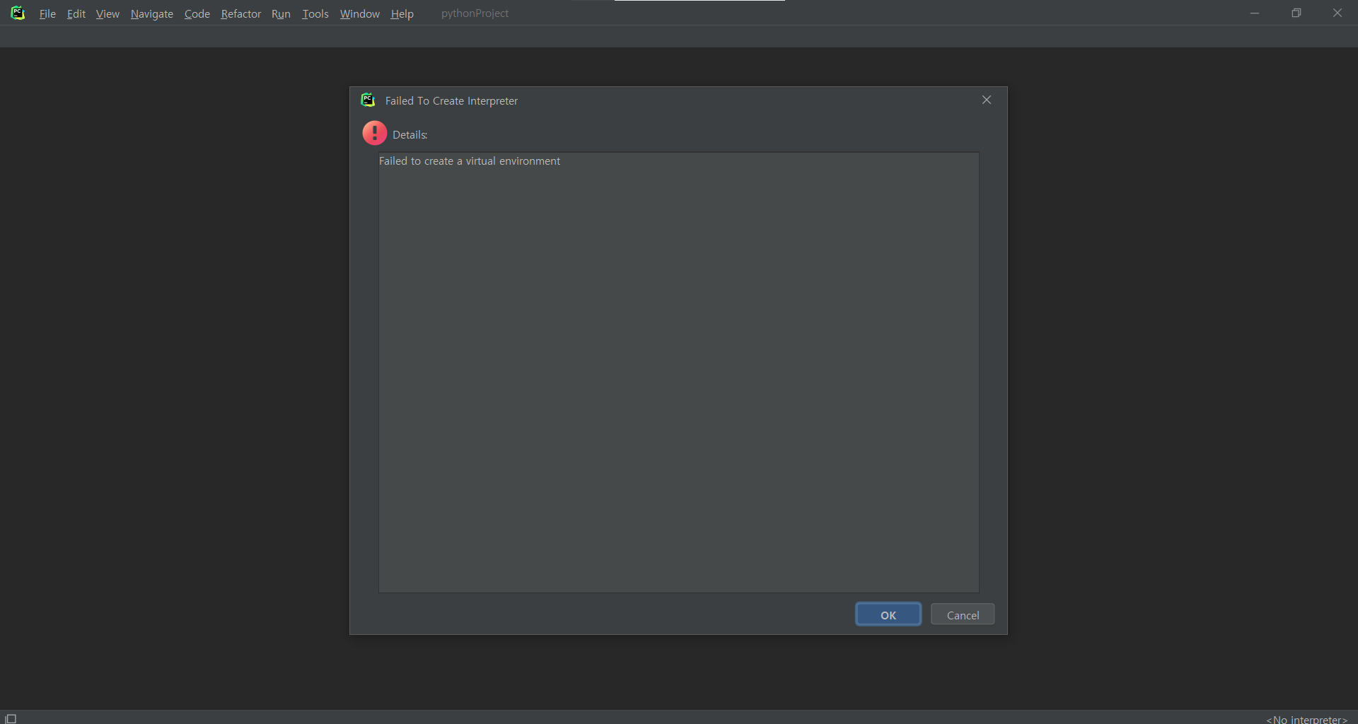 파이참 오류 : 가상환경을 생성하지 못했습니다. Failed to create a virtual environment