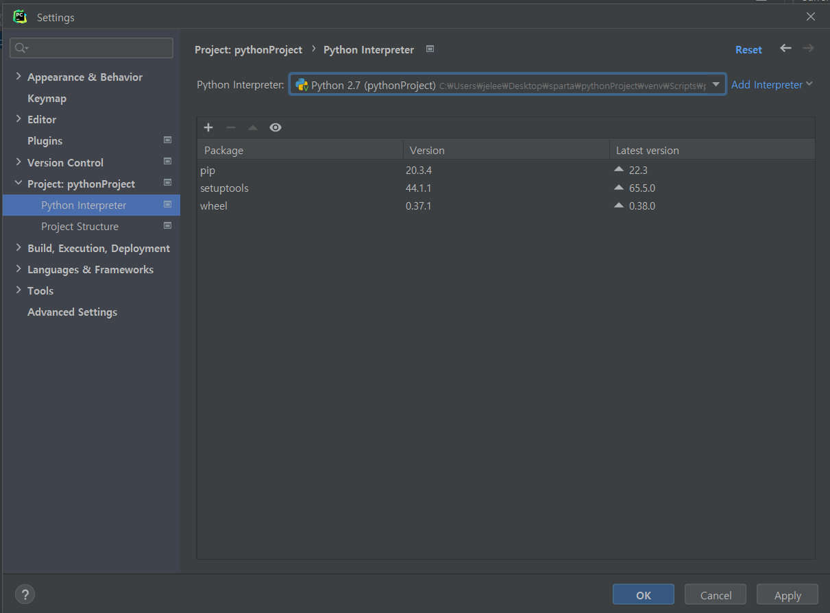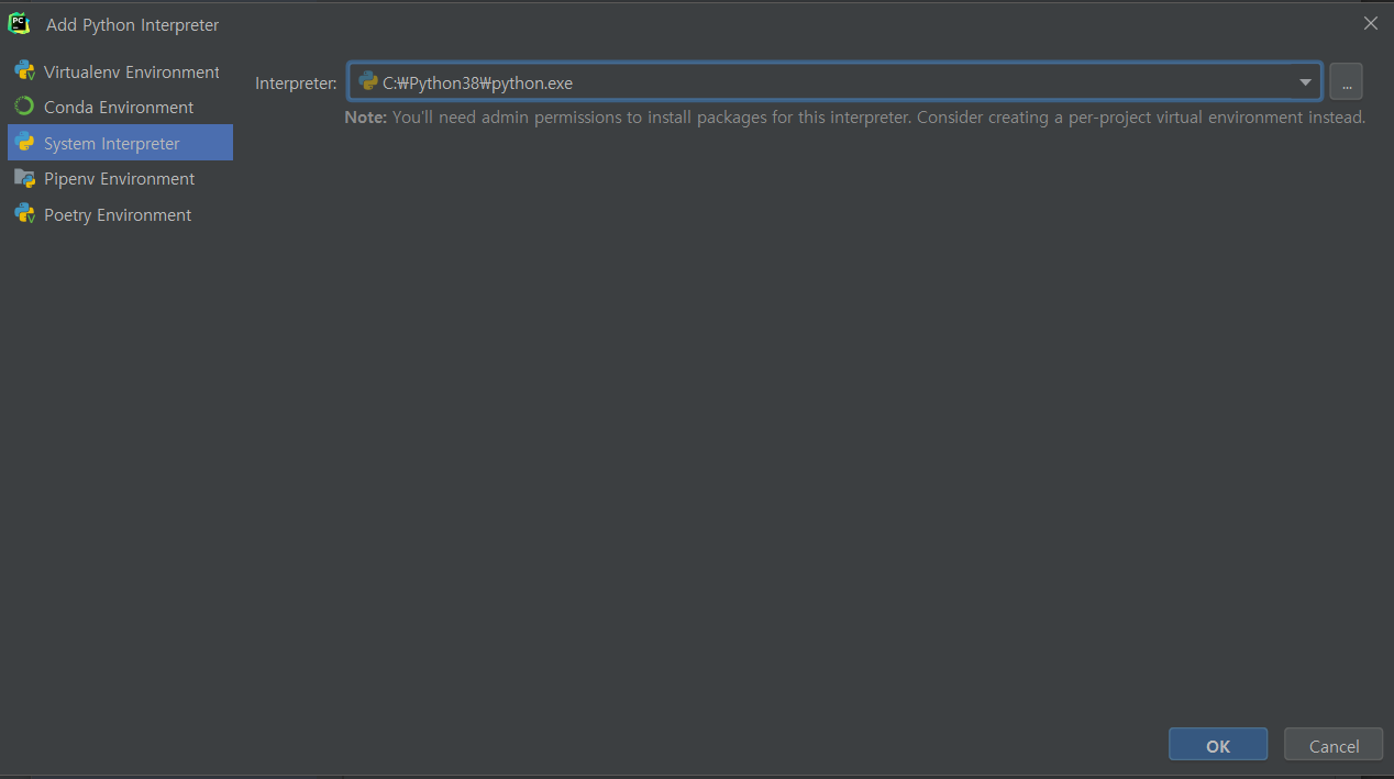 *시스템 인터프리터 경로는 Add Interpreter > System Interpreter에 지정하는 경로↓