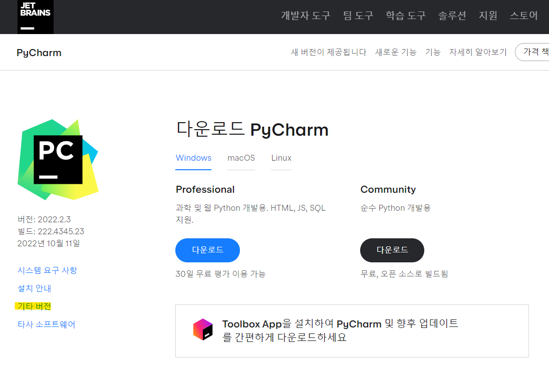 2. 기타 버전에 들어가 자신의 환경에 맞는 2022.1버전 파일 다운로드