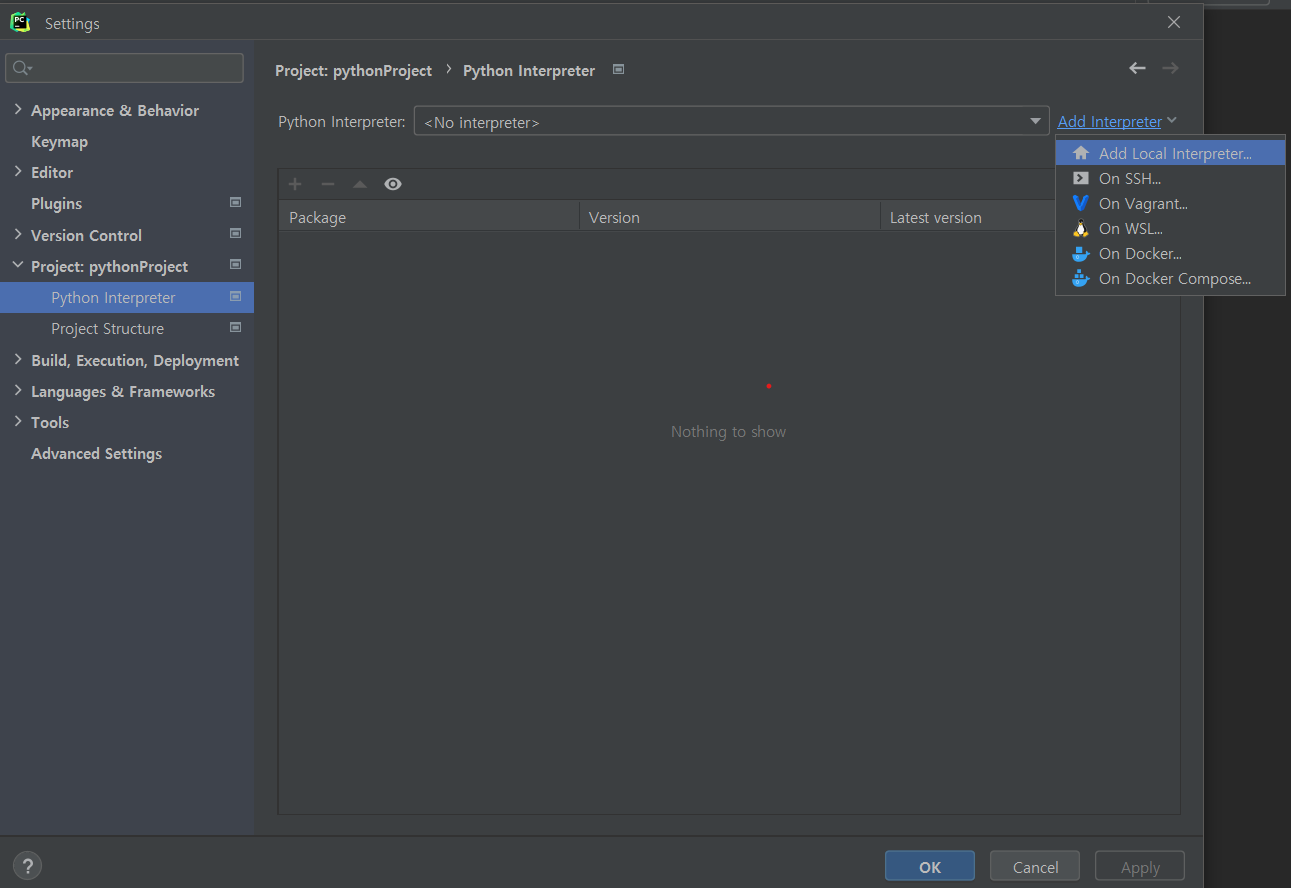 1) File → setting → Project → Python Interpreter → Add Interpreter → Add Local interpreter