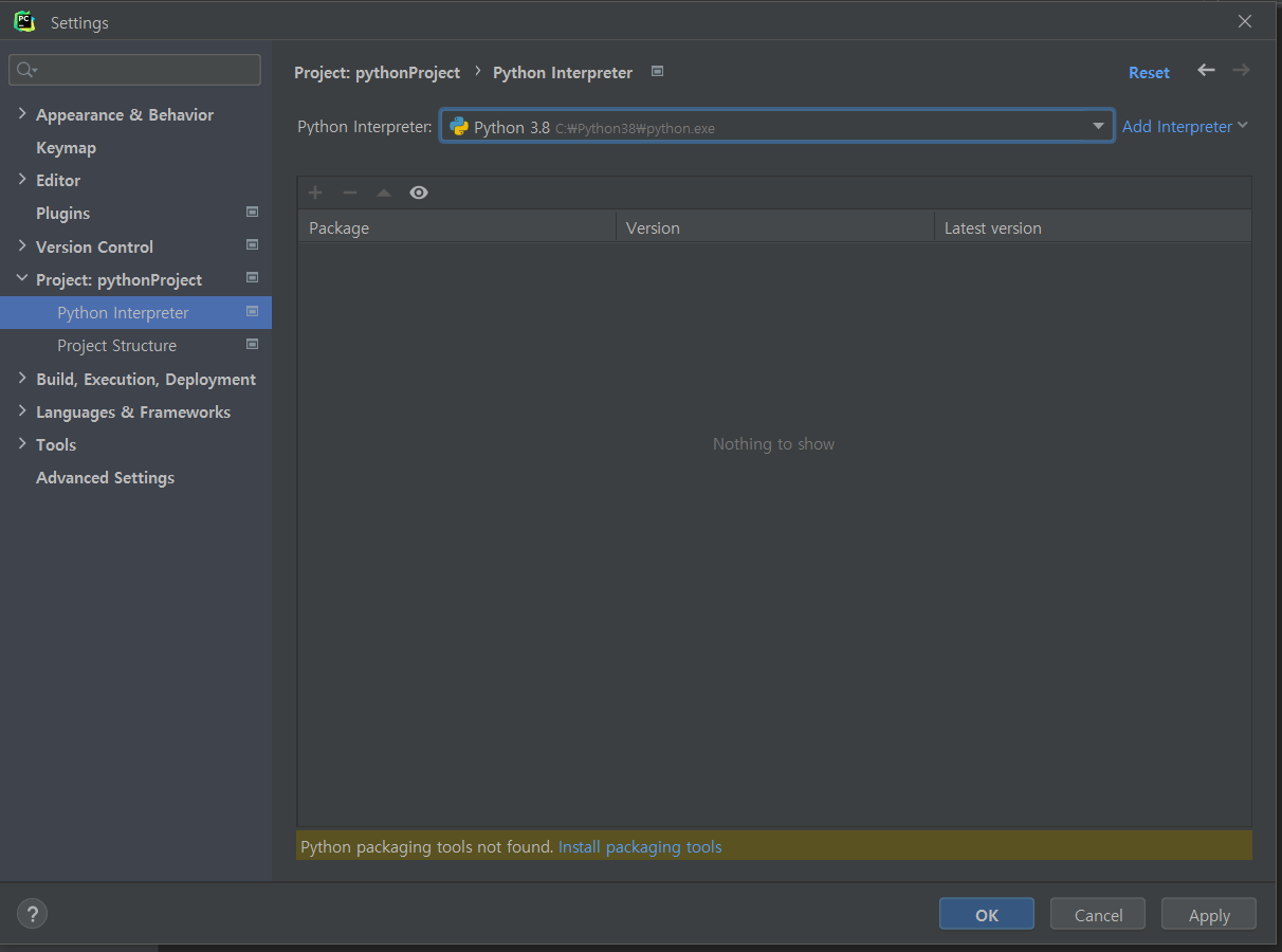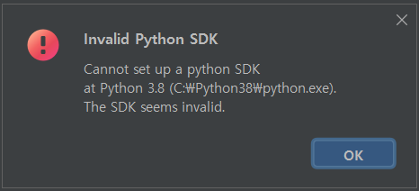 Cannot set up a python SDK at Python 3.8(경로). The SDK seems invaild.
