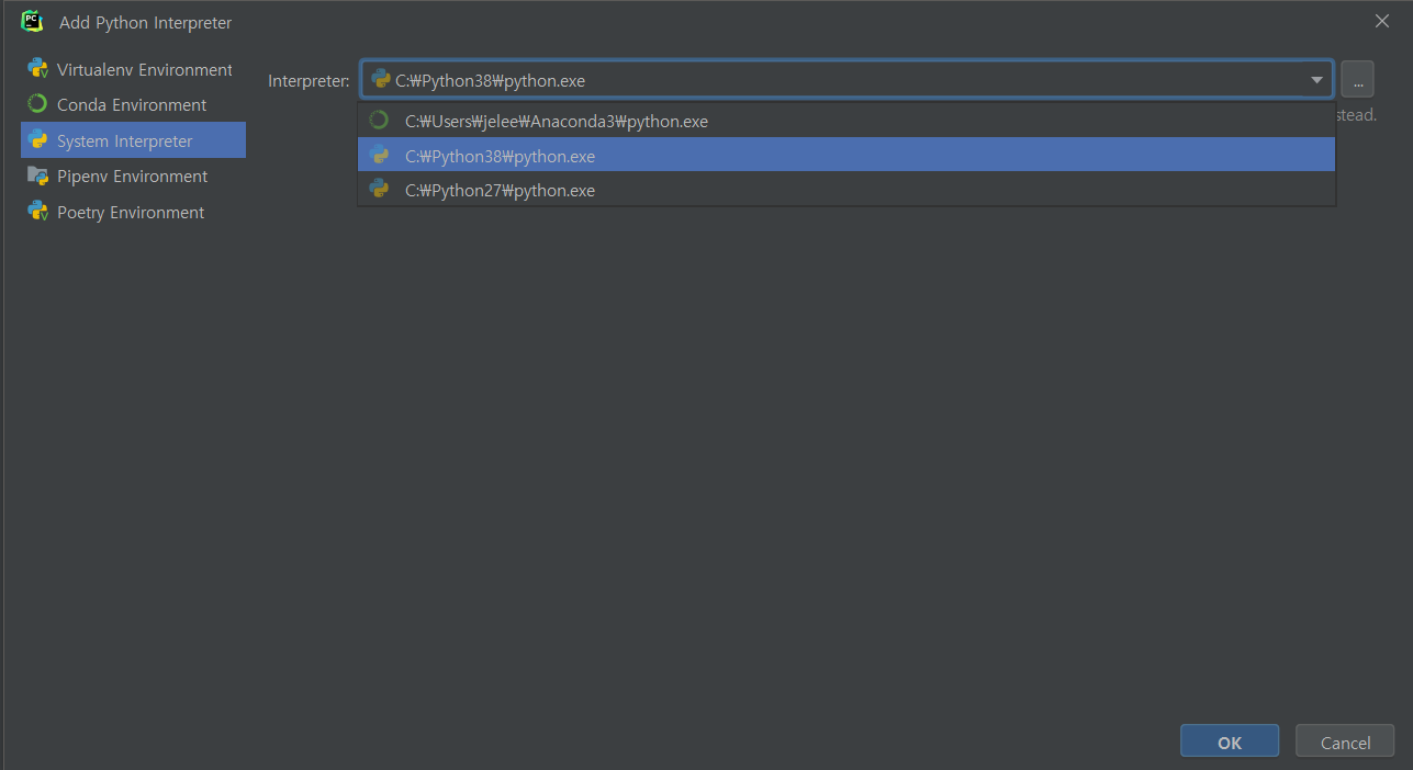 2) System Interpreter → 원하는 파이썬 버전의 인터프리터 선택