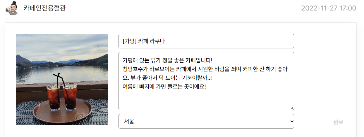 onEditing 함수가 반응하게되면 수정, 삭제 버튼이 안보이고 완료버튼이 나타나게 되고 기존의 텍스트 데이터들은 안보이고 input창, textarea창, 지역선택 창이 보이도록 한다.
