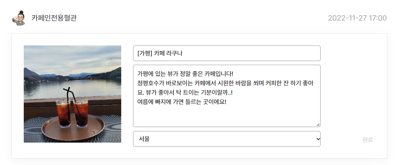 글쓰기 페이지에서 포스트 버튼을 누르면 DB에 저장되었다. 기능은 어느정도 구현되었지만 사진과 제목, 내용을 필수로 하기 위한 추가 작업을 남겨두었다. 또 글쓰기 페이지를 구현했기 때문에 DB 데이터를 확실히 알 수 있었고 메인페이지에 데이터를 뿌리는 기능을 구현할 수 있었다. 또 footer 디자인 추가 및 글쓰기 페이지의 글자수 제한 기능도 추가했다.