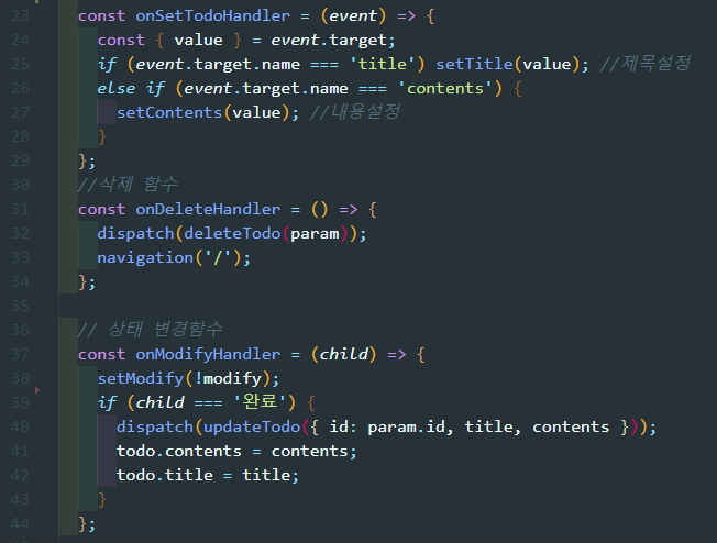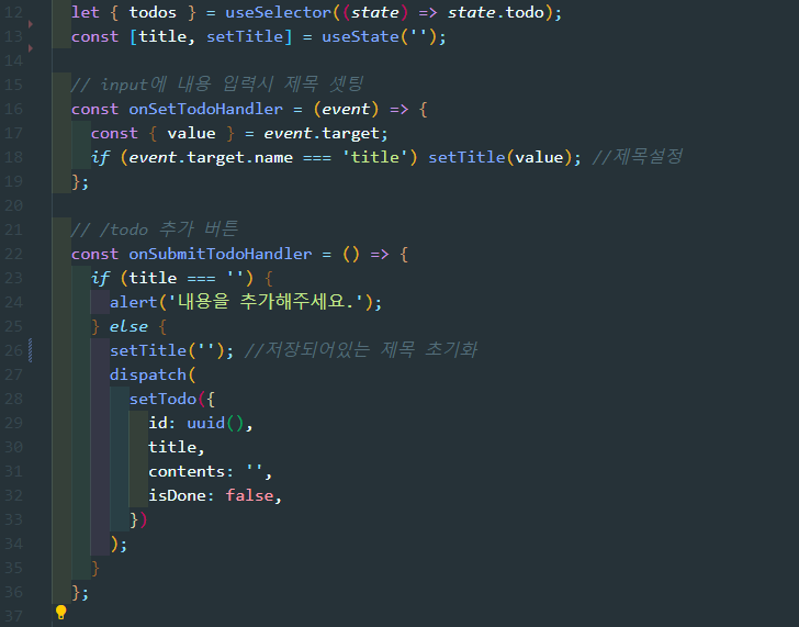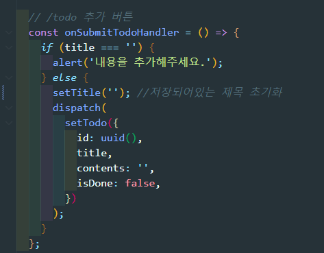 1) 메인페이지에서 input창에 내용 입력하여 버튼 클릭 시 dispatch를 통해 setTodo에 새로운 데이터를 payload로 전송