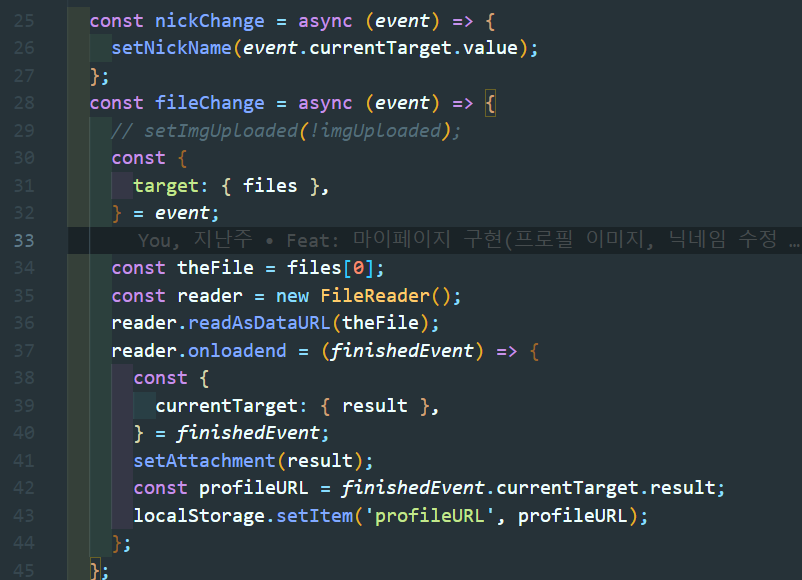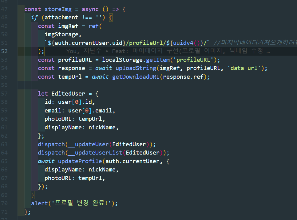 fileChange 함수로 파일을 변환하고 storeImg 함수로 파이어스토어에 저장한다.