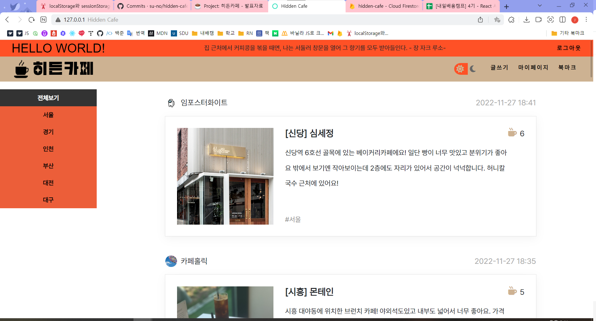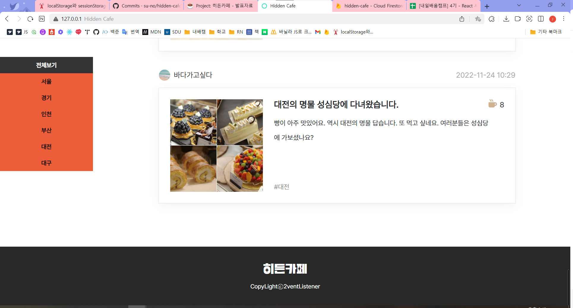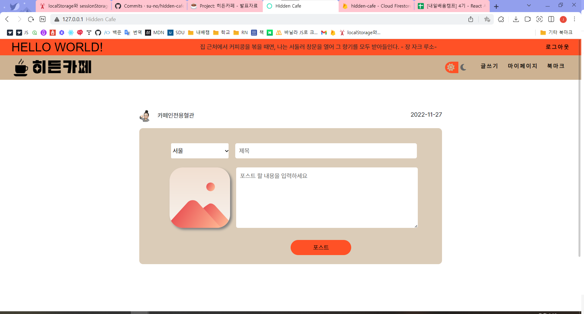 글쓰기 페이지에서 포스트 버튼을 누르면 DB에 저장되었다. 기능은 어느정도 구현되었지만 사진과 제목, 내용을 필수로 하기 위한 추가 작업을 남겨두었다. 또 글쓰기 페이지를 구현했기 때문에 DB 데이터를 확실히 알 수 있었고 메인페이지에 데이터를 뿌리는 기능을 구현할 수 있었다. 또 footer 디자인 추가 및 글쓰기 페이지의 글자수 제한 기능도 추가했다.