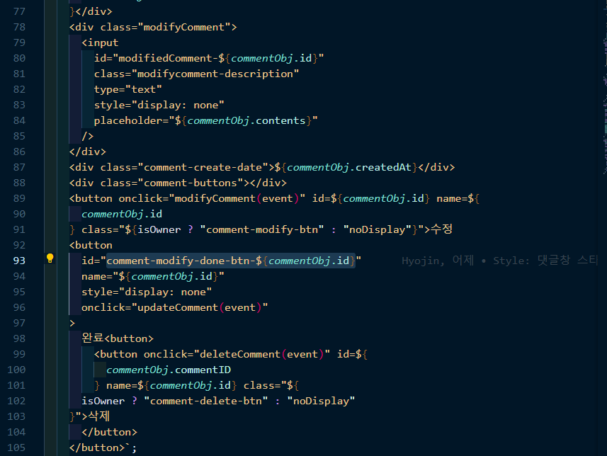 또 마리나님이 댓글 수정, 저장 기능을 구현 중에 있었는데 댓글은 한 post 내에서 여러개의 id를 가진 사람들이 작성하는 글이다보니 매우 복잡했다. 그래서 수정, 삭제, 완료 버튼의 사용자를 각각 구분해줄 수 있도록 식별자(id)를 추가해야했다.